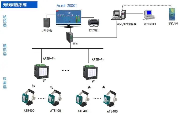 無線測溫顯示單元ARTM-Pn可無線接收多達60個ATE400傳感器的數(shù)據(jù),傳感器和顯示單元之間通過數(shù)字ID進行識別,準確定位每個電氣發(fā)熱點的溫度。顯示單元嵌入式安裝在低壓柜面,實時顯示各點溫度,并且可以根據(jù)用戶設(shè)定預警、報警溫度值,實現(xiàn)高溫預警、超溫告警、相間溫差報警、溫度突變量告警等功能,裝置可存儲120條帶有時標的告警記錄,同時告警時繼電器出口可以控制聲光報警器和切斷故障回路,幫助用戶及時發(fā)現(xiàn)故障,盡快分析查找設(shè)備故障原因,恢復正常供電。此外顯示單元還可以選擇電參量測量功能,測量數(shù)據(jù)包括電壓、電流、有功功率、無功功率、功率因數(shù)、電能等。顯示單元所有測量數(shù)據(jù)都可以通過485接口及標準Modbus-RTU協(xié)議接入邊緣計算網(wǎng)關(guān),實現(xiàn)網(wǎng)絡組網(wǎng),將數(shù)據(jù)上傳至無線測溫監(jiān)測系統(tǒng)主機。